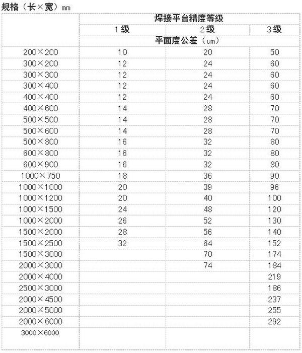 焊接平臺精度:按國家標(biāo)準(zhǔn)計量檢定規(guī)程執(zhí)行,分別為1、2、3四個等級。